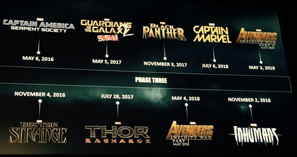 Announces today by Marvel: Thor: Ragnarok Captain America: Civil War Doctor Strange Inhumans Captain Marvel Black Panther Guardians 2 And a 2 part Avengers: Infinity War.
